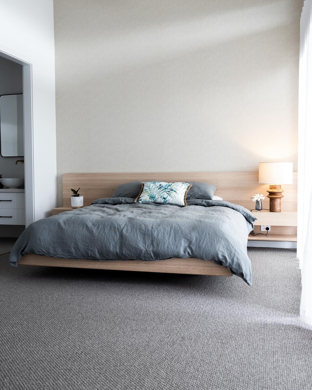 The floating design makes the room appear larger, while the earthy details maintain a grounded, welcoming vibe.