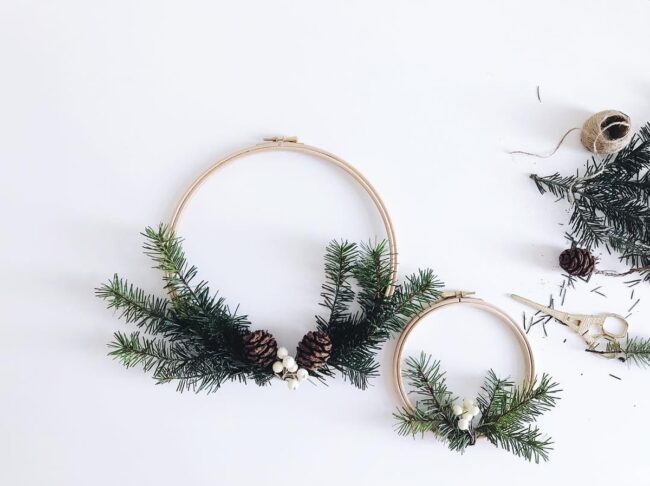 Wreath art is fresh take on seasonal decor that combines natural elements with simple craftsmanship. Using embroidery hoops as the base, you can create stunning displays by adding evergreen branches and pine cones for an organic feel.