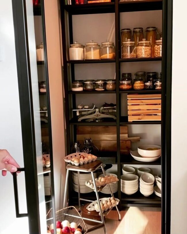 Stylish pantry is seamless blend of functionality and aesthetics. Featuring sleek black doors with glass panels, it invites natural light while showcasing neatly arranged shelves filled with decorative jars and baskets.